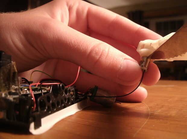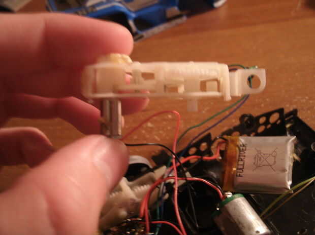 Ahora, tienes que iniciar el desmontaje de las ruedas. Para mi coche había una rueda en la parte delantera y una rueda en la parte posterior. Para un diverso coche puede haber dos en frente y dos en la espalda. Si esto es así, quite los dos delanteros y también quitar la rueda derecha trasera. Para este coche aquí, hubo marchas y un pequeño motor interior para mover las ruedas en un movimiento circular. Tuve que usar un cuchillo para esta parte para separar el motor de los engranajes. Si tienes el mismo coche que yo entonces también puede mantener este motor para uso futuro. Mantenga el motor en el circuito por el momento.