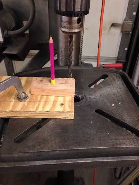 Yo utiliza el lápiz como un eje de 1 x 2 y el lápiz de una pulgada y media o así. Sujeta la pieza a la mesa del taladro de base. Utilice el taladro para perforar un agujero para que coincida con el pasador que va a utilizar en la línea que corre a lo largo de 1 x 2. Tenía una espiga de 5/16 de pulgada.