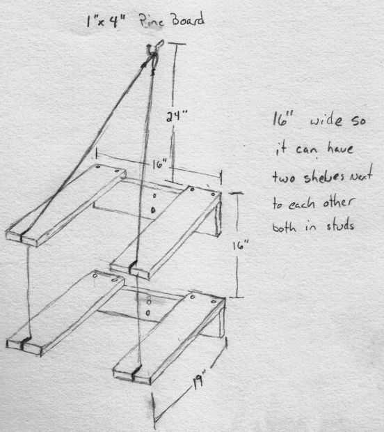 Aquí están mis dibujos refinados. La primera imagen es el esbozo general. En esta muestra dos yoes, pero construí tres (sólo duplicar las dimensiones del segundo estante). Esto me dio las dimensiones básicas que podría construir de. La idea es que el peso se llevará por la junta vertical que se unen en el perno y cable de acero. Mientras que las juntas horizontales del equipo.