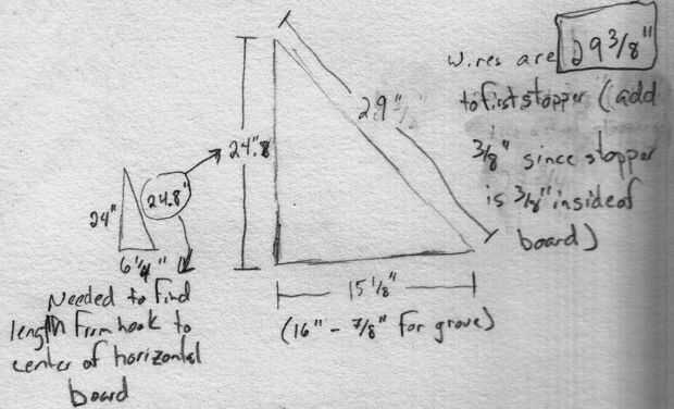 Última imagen me es calcular donde poner los tornillos de tope en el cable de acero. A cuadrada + B cuadrada = C cuadrada. Tenía dos triángulos a averiguar por este, ya que el gancho no es directamente sobre el punto entre las placas. Cometí un error de cálculo en el gráfico a continuación (ver notas). La medición final para poner el primer tope es 30 1/2"