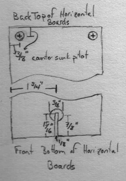 Siguiente imagen es los detalles de la Junta. Donde he querido poner los agujeros y cortes con las medidas. Un 3/8" ancho por 3/8" hoyo profundo corta las juntas en el centro (1 3/4 pulg) 7/8" en el extremo de cada una de las juntas horizontales. Un surco se corta es decir 15/16" de largo. Esta ranura permite que el cable Deslice y luego descansar el sujetador del tapón en el orificio de 3/8".