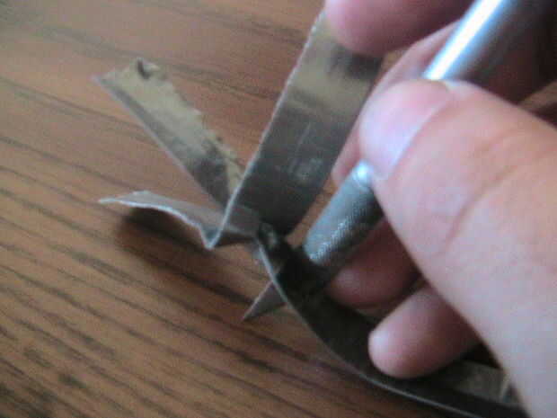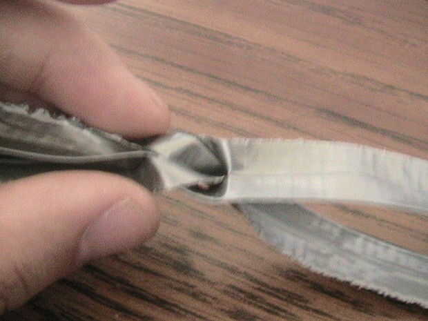 Ir hasta el punto donde cruza una cinta a través del otro. Alrededor que punto de corte una raja en la cinta pasa por uno (no debe tener una abertura en ella todavía). Se trata de la cinta con su extremo más largo en la parte inferior.