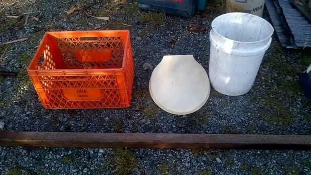 usaba lo que era en mano. -Inodoro -Cajón de leche vieja escuela -Una pieza de 2 x 2 -5 galones del cubo de la panadería local -16 tornillos de madera de 1.5 pulgadas