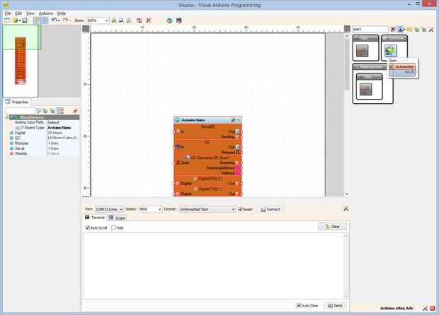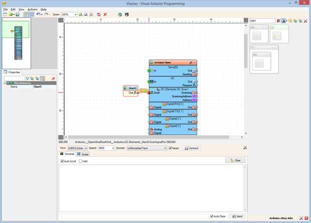 2. Conectar la clavija "a" del componente Start1 a la a la clavija de entrada de "exploración" del elemento "I2C Scan1" de la "I2C. Elementos"del componente de Arduino (foto 2)