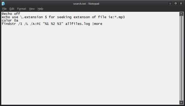 Findstr /I /L /A:FC "%1 %2 %3" k:\finder\allfiles.log |more