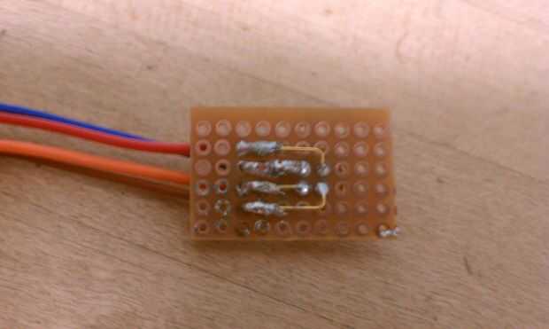 Cortar un pequeño trozo de placa de circuito a través del agujero largo suficiente ajuste que lleva el sensor de temperatura y cuatro hilos. La soldadura de los cables y los cables en la placa, dejando unos 7 del alambre para permitir que gire el ventilador. La f más lexible el cable, mejor será tu vida. El servo tire cosas aparte si no eres cuidadoso (como se puede ver claramente en mi vídeo).