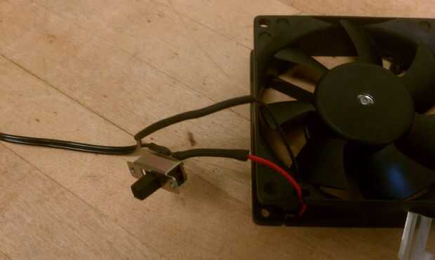 Encontré un transformador de 12V DC ahí, así que había soldado directamente a los cables del ventilador, incluyendo un interruptor en uno de los cables para mayor comodidad.