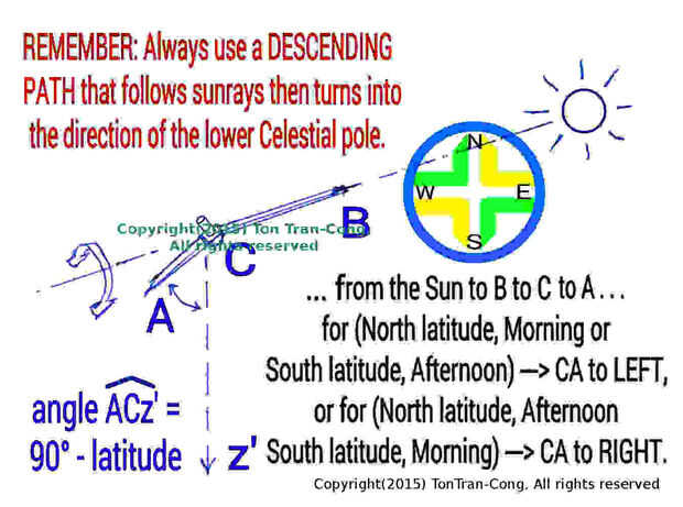 La rosa de los vientos en la figura ayuda a elaboración de la dirección para dar vuelta a la ruta. Por ejemplo, si el método se utiliza por la mañana en una latitud norteña, el camino a lo largo de los rayos del sol viene del este y tiene que girar a la izquierda para ir al polo sur celeste (ya que este polo sur Celeste es el polo inferior de la celeste en la latitud norte), la ruta se muestra en color verde en la rosa de los vientos.