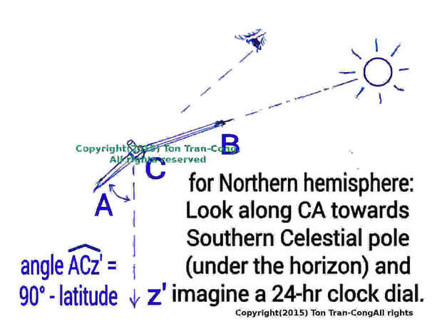 Mientras mira hacia abajo al polo sur celeste desde el hemisferio norte, un observador puede imagina una esfera de reloj de 24 horas conectado a ese eje, teniendo como el eje de la esfera. La marca de mediodía de esta esfera del reloj tiene la posición más alta en el dial.