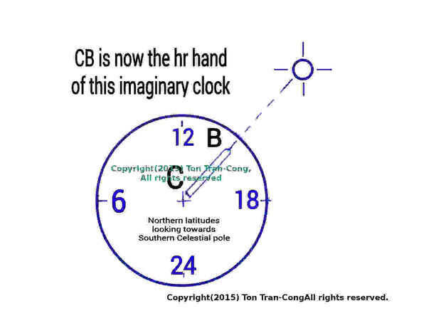 La marca de mediodía de esta esfera Celestial del reloj es el más alto en el dial. CB se mueve como la manecilla de este reloj Celestial para dar la hora local. Hora local está cerca pero no es la hora oficial zonal, muestra 12:00 cuando el sol está más alto en el cielo.