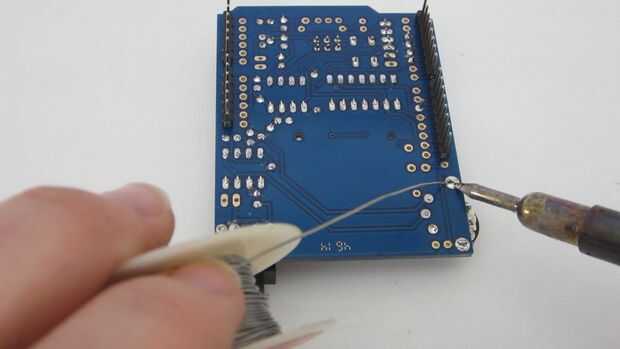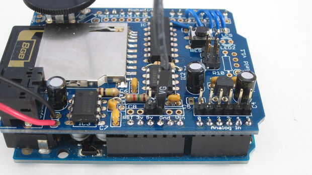 El protector de la onda se conecta a la placa Arduino con los pernos de encabezado en la parte inferior del tablero de la onda. Estos pernos ajuste en los zócalos de patillas en el Arduino. Junto a los agujeros de perno donde se montan estos pines de cabecera es un segundo conjunto de agujeros que se conectan a ellos. Estos le permiten conectar componentes externos a los pines de Arduino. Puede soldar los cables directamente a estos agujeros o puede utilizar pasadores de encabezado para las conexiones desmontables. El kit viene con ocho conectores de encabezado adicional. Dos de estos soldados a los 5V y GND pin agujeros. Los seis restantes conectado a los pines de entrada analógicos.
