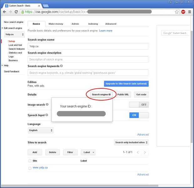 En nuestra configuración de motor de búsqueda personalizada, haga clic en "ID de motor de búsqueda" y tome nota de él. Ahora hemos obtenido todas las teclas necesarias e ID!