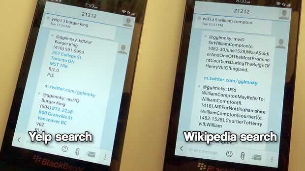 Para realizar una búsqueda de Yelp - enviar un SMS a twitter shortcode (es decir, tweet) la búsqueda de una consulta en el formulario: "yelp [cadena aleatoria] [máximo número de resultados devueltos] [búsqueda cadena]"