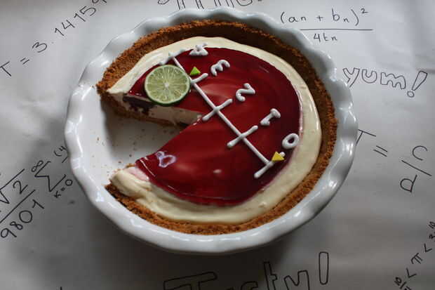 Para la corteza elegí una costra de miga que creo que es la clásica combinación de cítricos y tartas. Entonces, derramé la cremosa, deliciosa Granada-cal de relleno que tiene un pequeño matiz de un color rosado. Tengo que admitir era un poco de un reto colocar la ganache en un relleno tan aterciopelado pero al final, y contra todo pronóstico, resultó de gran! Luego hice un gelee de Granada para actuar como un fondo para el gráfico y el pastel con algunos zing. Cuando llegó a las decoraciones, mi padre era el genio detrás de todo esto. Juntos discutimos ideas interesantes porque estaba buscando una relación entre la parte superior y el interior de la tarta. Él encontró este gráfico, que explica el concepto geométrico de pi. Se puso muy en él y estaba muy entusiasmado, ya sea gane o pierda, al menos recibí! (y un delicioso pastel, así!)