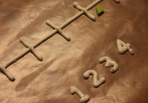 Tubería el royal icing decoraciones sobre papel pergamino (facilita sacarlos mucho), se salieron de seco durante la noche y luego se coloca sobre la tarta. La flecha verde fue una decoración de azúcar redondo, he utilizado un cuchillo para que se vea como un triángulo.