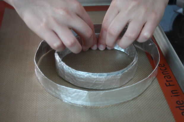 Haciendo el molde para la parte superior del signo de pi. El siguiente paso es la línea con envoltura de plástico y verter la ganache. Las "patas" del pi fueron realizadas por dos circunferencias de ganache en la parte superior de tuberías.