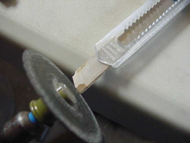 Suavemente tomé suficiente carne de cada lado, para que la hoja era más delgada que el papel, entre las ranuras. No desea una hoja gruesa estupenda que empujará a las clavijas de un lado, romper sus conexiones de soldadura. (Esto me pasó, pero fueron fácilmente reparado)