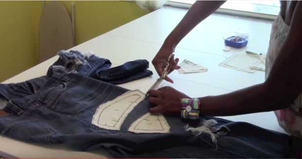 Agarra un par de jeans viejos y cortarlos hasta la costura interior de la entrepierna. Necesita cortar dos de cada pieza. Sin embargo, uno a la vez. Poner la cara de la pieza de patrón y para el segundo lugar cortar la pieza boca abajo. Necesita un lado izquierdo y lado derecho.