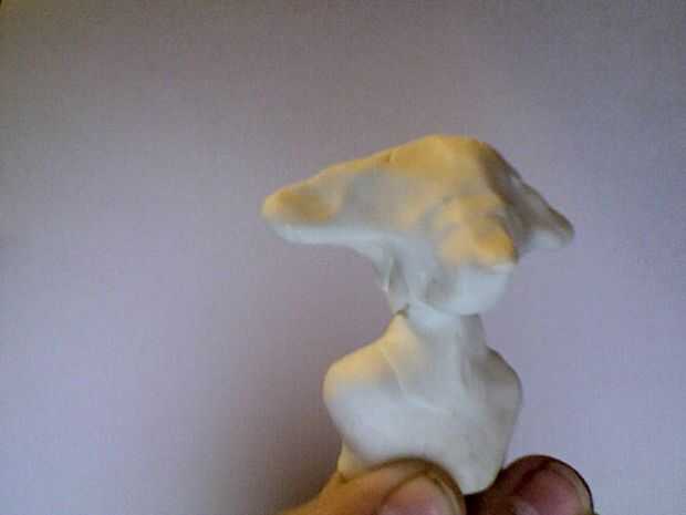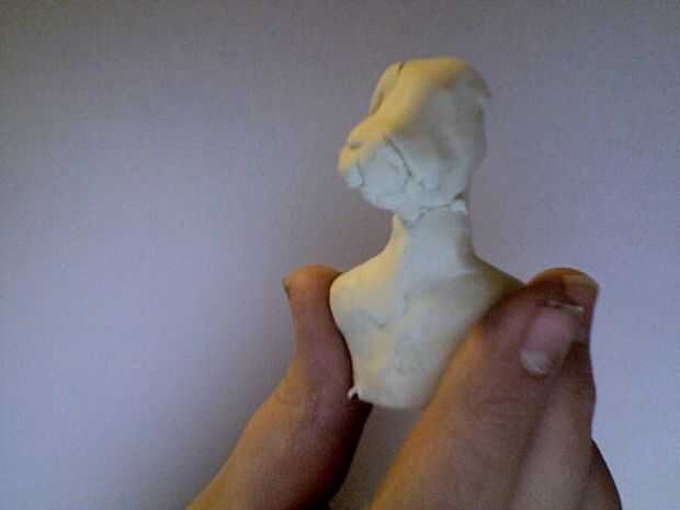 decidí hacerlo una especie de busto de la cosa en lugar de una estatuilla, así que comencé tomando un trozo de arcilla aproximadamente una pulgada alta y ancho y en forma de esto es su pecho, hombros y espalda. Luego le puse un trozo ligeramente mayor en la parte superior de su cabeza. De esta pieza comencé a la nariz y también el cuello y un poco de la cabeza. A continuación he añadido sus orejas disquete en los lados y amplió un poco la cabeza.