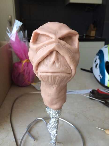 La 'cosa' o 'barba' en su mentón sobresale estaba hecha de una sola pieza de arcilla y pegué un alambre de metal en ella. De esta manera pude anexarlo a su barbilla. Otra vez: planificar con antelación porque tenía a este atasco en la barbilla de la arcilla y la capa subyacente de la hoja con cinta ;-) Usé algo de presión para esto y sí, el pink-ish Super Sculpey deformado. Así que esto me tomó un tiempo para hacerlo bien!. Asegúrese de que al comprimir la arcilla con una buena herramienta para la capa de arcilla que es la barbilla. Al tiempo de cocción que los polímeros se unen por el calor, esto le ayudará a poner firmemente.