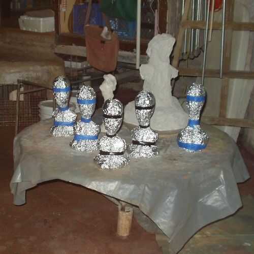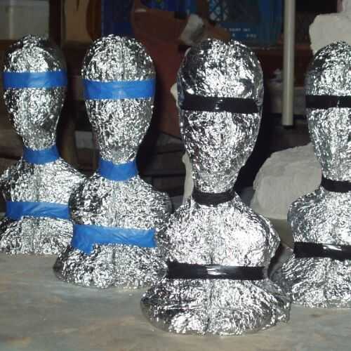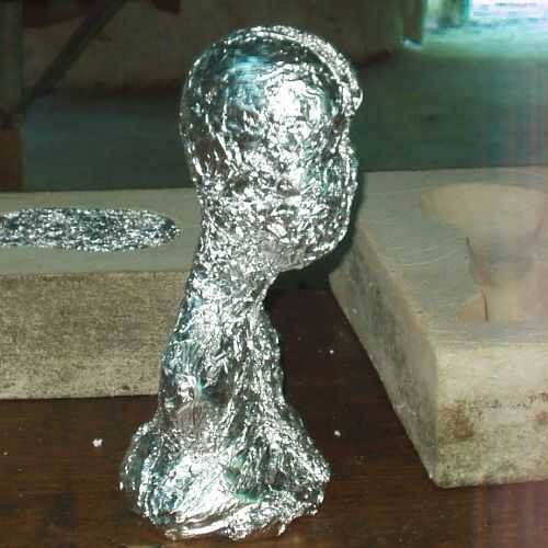 Las mitades izquierda y derecha de aluminio de la base están grabadas juntos.  Tres bandas de cinta alrededor de los ojos, cuello y pecho de hacen el trabajo.