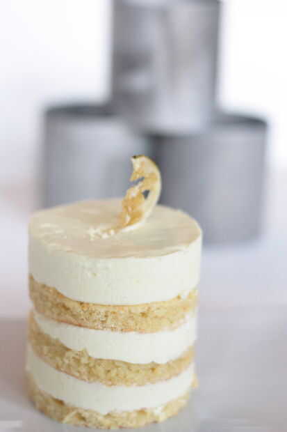 Utilizando un molde de anillo de 3" como un cortador, corta círculos de torta hacia fuera del pastel de hoja.