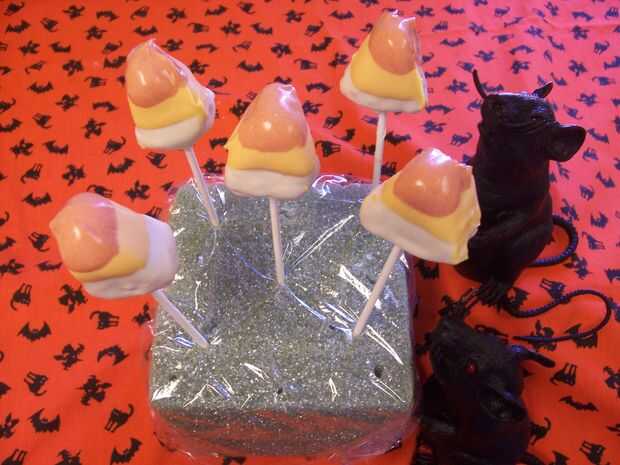 Próxima inmersión 2/3 del pop en el caramelo amarillo se funda y otra vez permitirles frío/seco en el bloque de espuma. Mientras estos se secan, MW derrite el caramelo de naranja.