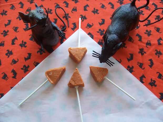 Sumergir un palo de Chupa-Chups en el caramelo caliente derretimiento e inserte en la parte inferior de cada triángulo. (OK para picar en trozos)