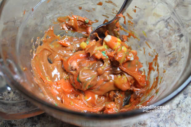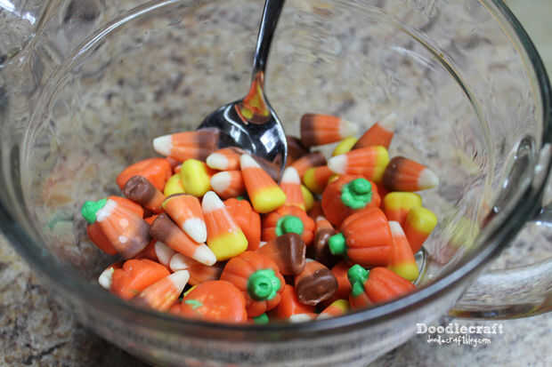 Poner 1 taza de surtido o maíz de caramelo en un recipiente adecuado para microondas.