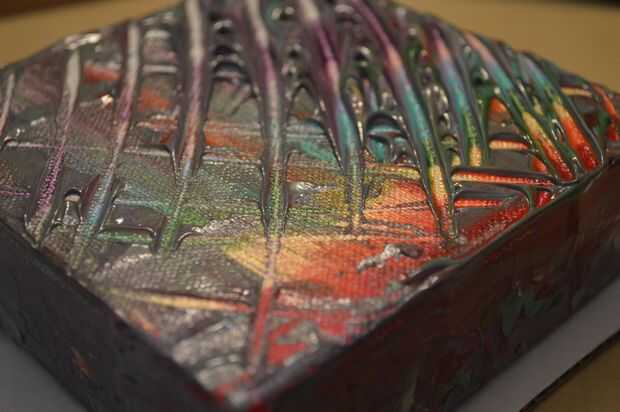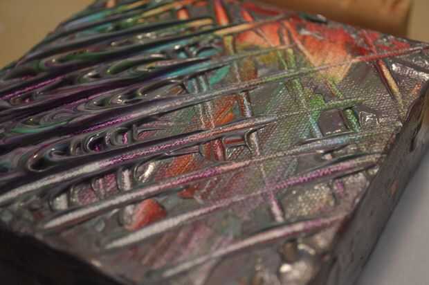 Materials needed:organza u otro material puro con un punto de fusión más alto que el celofáncelofán iridiscente (yo tengo la mía en la sección de envoltura de regalo de la tienda local de dólar)adhesivo en aerosolhierro en transferencia de camiseta (