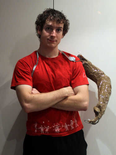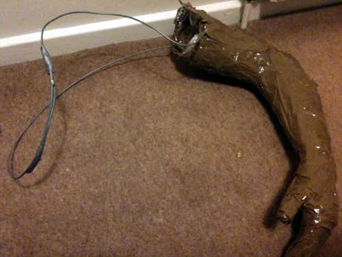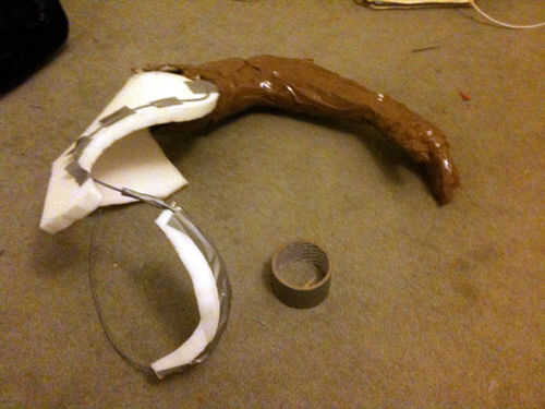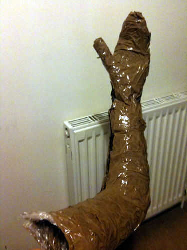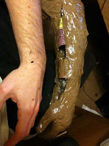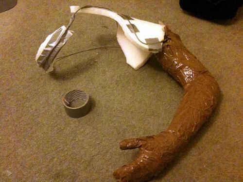 Después de unas pocas capas de cinta, debe sentir que la envoltura alrededor de su brazo se está volviendo lo suficientemente rígida para mantener su propia forma. En esta etapa, con cuidado corte una abertura en el lado para que pueda quitar su brazo real.