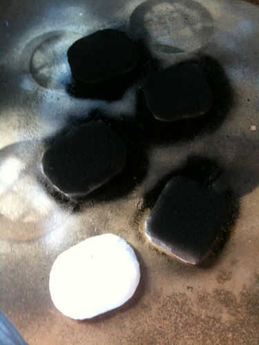 Para hacer pesos para sus zapatos, corte angular algunas formas de tarjeta y spraypaint ellos plata y negro. Entonces sólo sujete a la superficie de sus zapatos con cinta de doble cara.