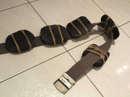 Para hacer un cinturón de peso, corta varios pedazos de espuma en bloques aproximadamente rectangulares y gradualmente a las esquinas para que se asemejan a grandes rodados. Entonces spraypaint en negro y gris y corbata ellos sobre un lienzo de la correa con retazos de cuero o marrón cadena de paquetes.