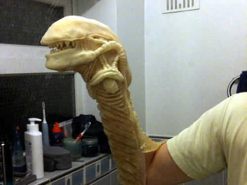 --Empezar haciendo tu Alien de plastilina. Trate de tamaño por lo que cabe muy bien en su mano y antebrazo. Hacer como de miedo mirando como sea posible.