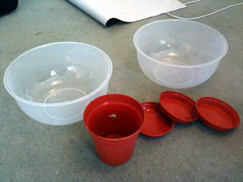 * Poner borde a borde, estos tazones de fuente deben hacer una esfera rugosa lo suficientemente grande como para adaptarse cómodamente a la cabeza. Una de las partes más divertidas de este Instructable fue ir al Departamento de utensilios de cocina de una gran tienda y probando diferentes tazones al intentar evitar los prejuicios resplandores de los asistentes de ventas.