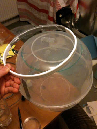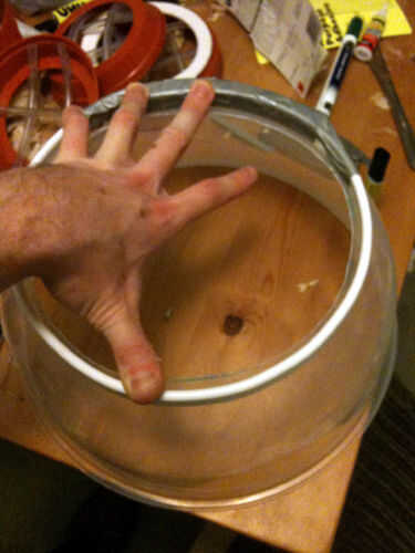 Coloque el aro en la base del tazón de fuente que formará la parte inferior del casco. Traza en torno a la hoop'sinside con un rotulador y cortar donde ha marcado. Hacerlo lentamente, como tazones de plástico son a menudo propensos a romper.