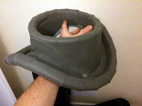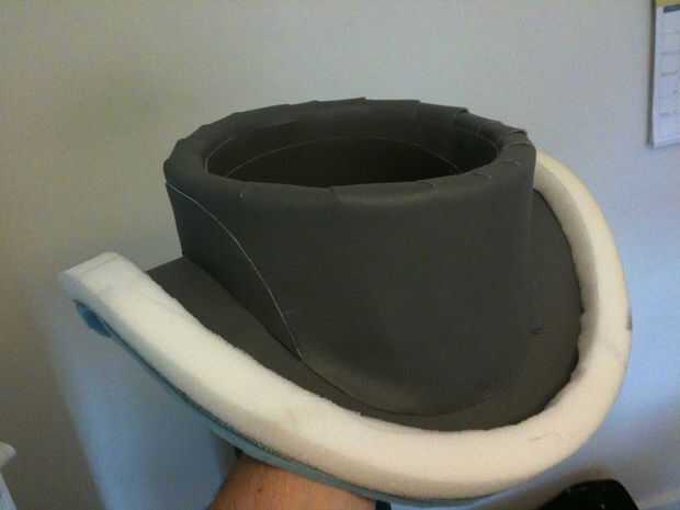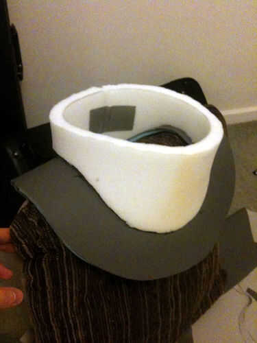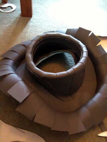 El collar de espuma en la parte superior esta el pegamento, luego envuélvalo en otro pedazo de tela. Para poner en orden la parte superior del cuello, cortar la tela con una serie de aletas y pliegan en el interior del collar. Luego la línea interior del collar con otra tira larga de tela.