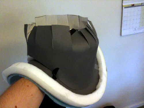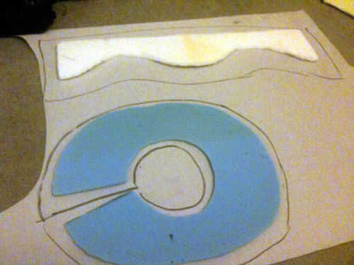 Ahora, vuelva a montar el collar con su cubierta de nuevo, esta vez pegar como vas. Comience por pegar a la tela a la elipse de espuma y recortar a la medida.
