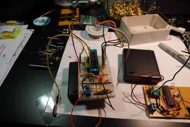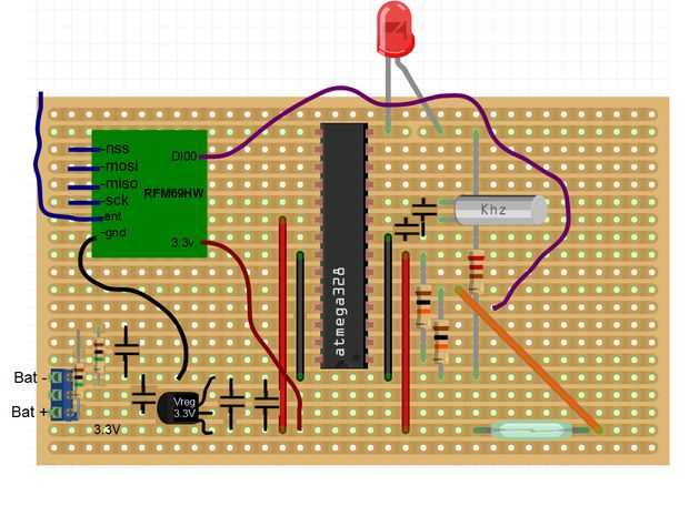 Siga el diagrama del circuito anterior y soldar los componentes. Puede que desee montar un prototipo protoboard para probarlo antes de comprometerse a un tablero de tiras soldadas, dependiendo de tu nivel de comodidad. Tenga en cuenta que hay dos lugares donde usted necesita para quitar el cobre de la Junta de tira. Con el LED y con el interruptor de láminas.