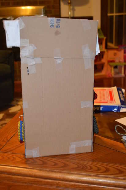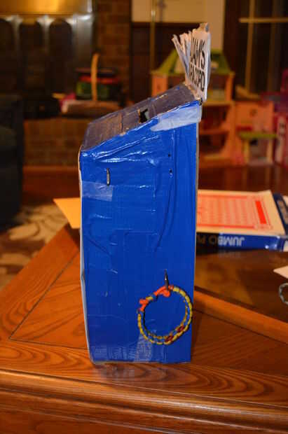 No realmente lo utilizo como un cuadro de sugerencia, sino como una caja para recoger dinero y formas de orden. Lo diseñé yo mismo, sin el uso de otro instructivo. He hecho de una Lowe caja grande movimiento y mucha cinta Scotch. Luego lo decoré con cinta azul.