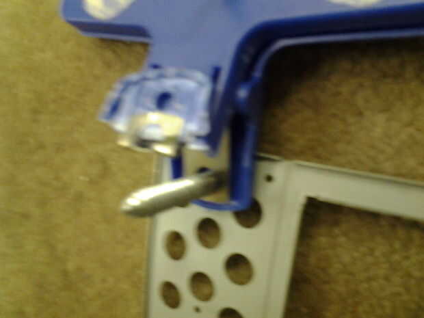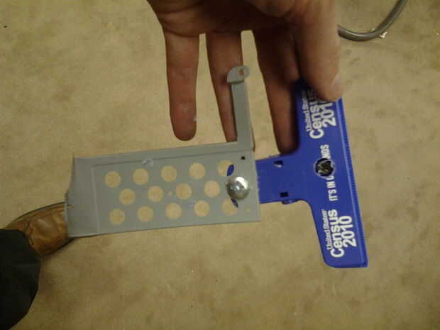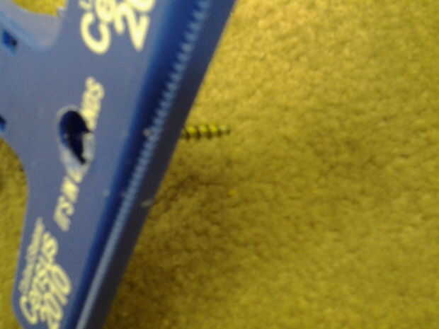 Haga un orificio en la solo la mitad del clip chip o simplemente broche de presión la mitad superior de un lado del clip chip. Después uno de sus tornillos madera ponga la otra mitad (cuadro #2)