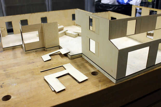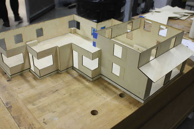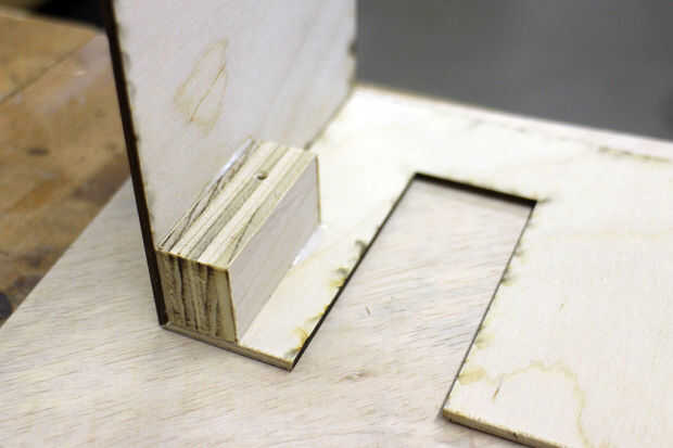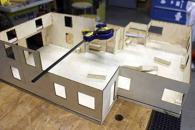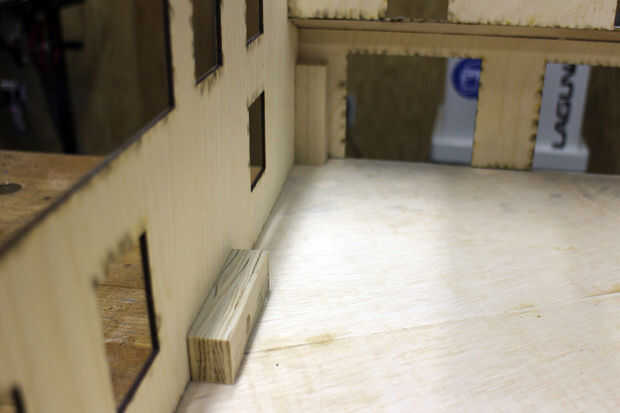 Después de alinear las paredes en la posición correcta entre sí había pegado una pequeña sección de la madera contrachapada en el interior de una pared, adjunto a continuación la pared adyacente. Seguí en distintas secciones de la pared, permitiendo que las secciones se seque por completo antes de que el pegamento en el pedazo siguiente. Finalmente se pegan todas las piezas de la pared exterior.