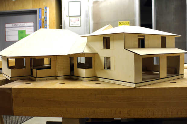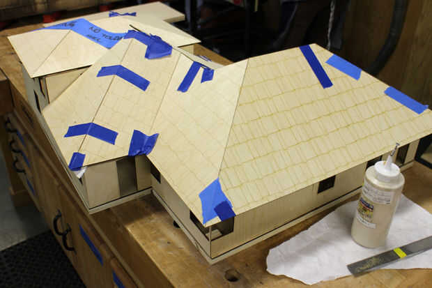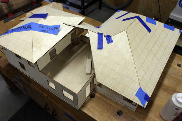 Puesto que los ángulos entre las secciones del techo no eran ángulos rectos, no podía usar el truco de usar secciones de madera rectangular que se unen las paredes. En su lugar usé una tira de papel para ayudar a sostener las secciones del techo con pegamento.