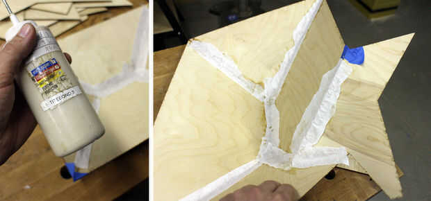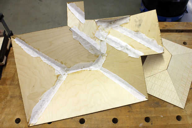 Dos secciones del techo adyacentes fueron colocadas cerca unos de otros, ejecutando una pequeña cantidad de pegamento en los bordes que emparejan. Apoyo de las dos secciones del techo en su banco de trabajo con algo debajo para mantener el ángulo correcto. Aplique una cantidad abundante de pegamento entre las secciones del techo y coloque con cuidado una tira de papel sobre el pegamento, cerrar la brecha entre las piezas. Deje que el pegamento seque completamente antes de mover dos secciones de techo pegado.