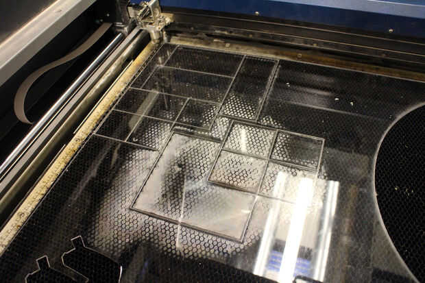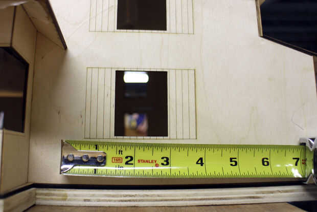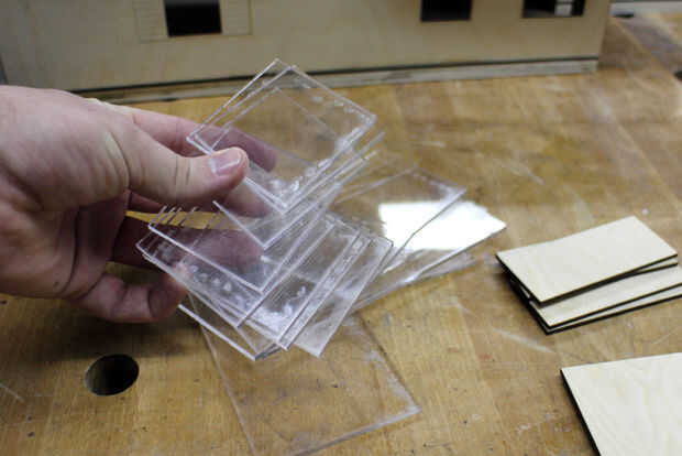 Después de medir las dimensiones de ventana modelo escala hice cristales de acrílico transparente, se cortaron un poco más grandes que las aberturas que había cortado por lo que pude pegar en desde el interior. Utilicé un cortador láser a inapropiadamente alta potencia para cortar este acrílico.