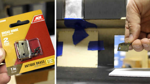 Usé las bisagras pequeñas para colocar las puertas del garage desde el interior del modelo. Puesto que los tornillos se penetran a través de las paredes de la modelo que decidí usar epoxi más.