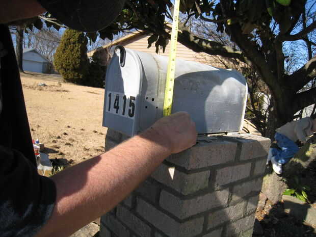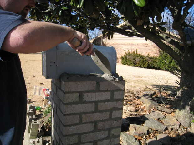 Este paso requerirá el corte de algunos ladrillos. Mostramos ladrillos "rotos" a la longitud correcta con un martillo de ladrillo, esto es algo que requiere práctica, puede intentarlo pero prepárate para un montón de ladrillos se romperá en pedazos inutilizables. Incluso y experimentado masón perderán algunos. Si no tiene suficiente ladrillo o si están preocupados acerca de perder demasiados debe alquilar una sierra de ladrillo de una fuente de la contratista. Hablar con la gente de allí y puede mostrar cómo usarlo correctamente. Siga todas las instrucciones. Mida la distancia desde el borde exterior de la columna a su buzón de correo y reducir que medida por 3/4 de pulgada (el ancho de la Junta de barro entre el ladrillo y el buzón) corta ladrillos según sea necesario para acabar su último par de cursos. Cuando haya llegado a la parte superior de la caja, continuar con su curso final sobre la parte superior del buzón para incorporar en su columna de ladrillo. Acabar su buzón de correo mediante la adición de la parte superior. Agregue una línea de frente de ladrillo al centro a lo largo de la línea del buzón, luego agregue ladrillo alrededor de ésos colgando fuera del borde de aproximadamente 1 1/2". Rellene los agujeros superiores con mortero y suave para un acabado con la llana. Ahora deberá terminar todas las juntas con una empalmadora. Rellene los orificios en las juntas con mortero más ahora. Use la juntera en cada articulación vertical y luego cada articulación horizontal (en la horizontal Asegúrese de unión de los bordes exteriores en hacia el centro, para no golpear el mortero de las juntas al final) ahora utilice un cepillo en 45 * ángulo, la columna entera del cepillo suavemente, usando una diagonal de barrido de movimiento y luego rejuntar a manchas suaves y ásperos. Empujar los tornillos de la bandera de buzón en una Junta de mortero antes de que establece. Permite establecer al menos un día antes de su uso. Disfruta de tu nuevo buzón.