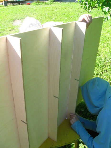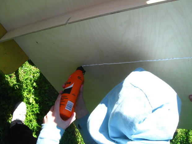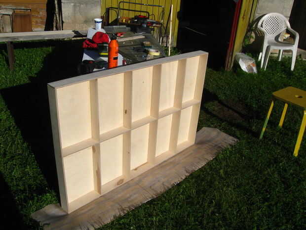 Empecé con las paredes internas y la posición de piso a la parte trasera de la pieza posterior de la marca y taladrar agujeros allí. Luego tuve papá ayúdame y ponemos con cola y tornillos.