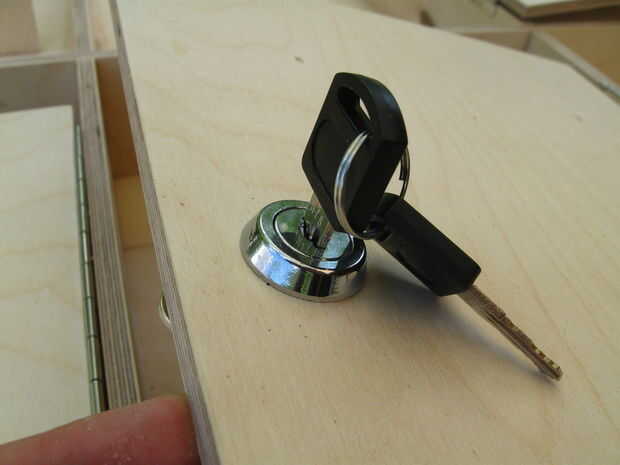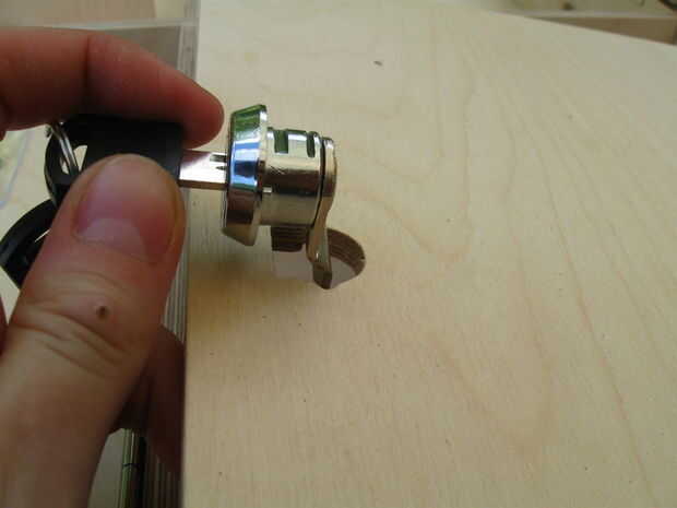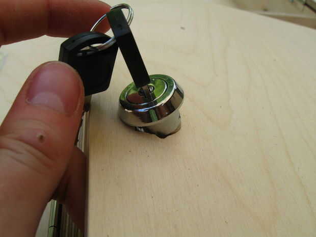 Las cerraduras tienen muescas que mantienen de vuelta en su lugar. Primero perforé dos agujeros pequeños en las ubicaciones de las ranuras. Luego perforé el agujero de 18mm para la cerradura sí mismo. Y debido a la forma y el hecho de la la cerradura no puede ser tomado aparte tuve que hacer un lado inclinado del taladro - entonces podría poner la cerradura a través del orificio. Utilicé un método demasiado peligroso para describir aquí para hacerlo. Pero un router sería la herramienta adecuada.