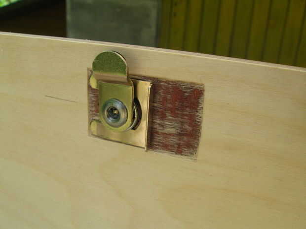 Tenían un tenedor en forma de y se inclinó pieza que iba a ir en las ranuras en los lados de la caja de bloqueo para mantener el bloqueo de caerse y quedarse plana a la puerta. La carcasa era casi tan profunda como el espesor de la madera contrachapada. Así que hice las 3 cosas.